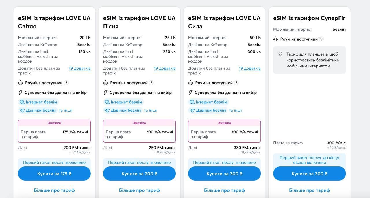Для новых номеров стоимость eSIM обычно включена в тариф и составляет от 150 до 280 гривен на 4 недели. Стоимость перевода существующего номера на eSIM — около 100 гривен.